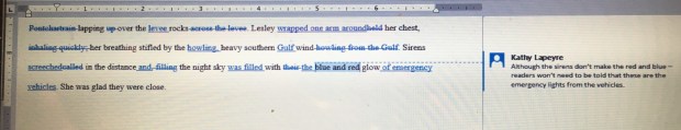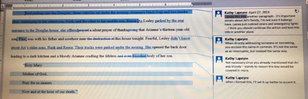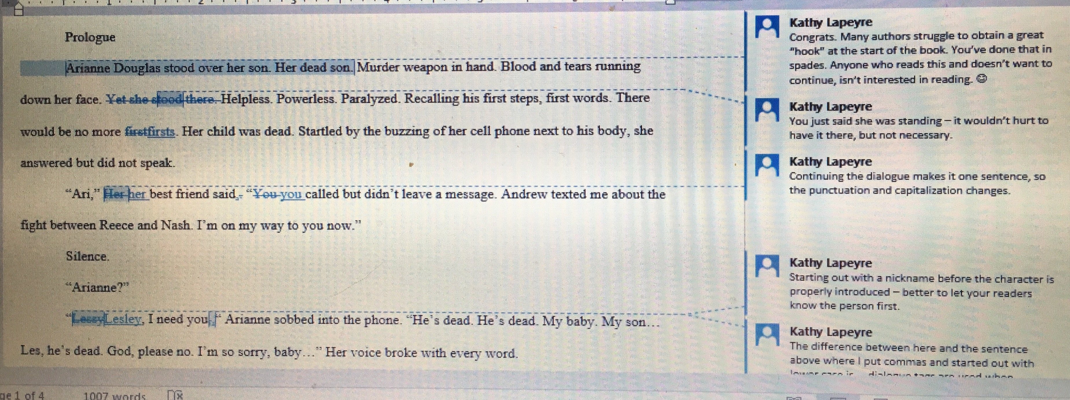 Below, I’d like to show you what editing looks like. Of course, all editors are different but if your editor isn’t teaching as she (or he) goes along, find someone else. Naturally, you should grow as a writer with each book, and your editor should be a huge part of that process. (You may need to enlarge my photos.)
