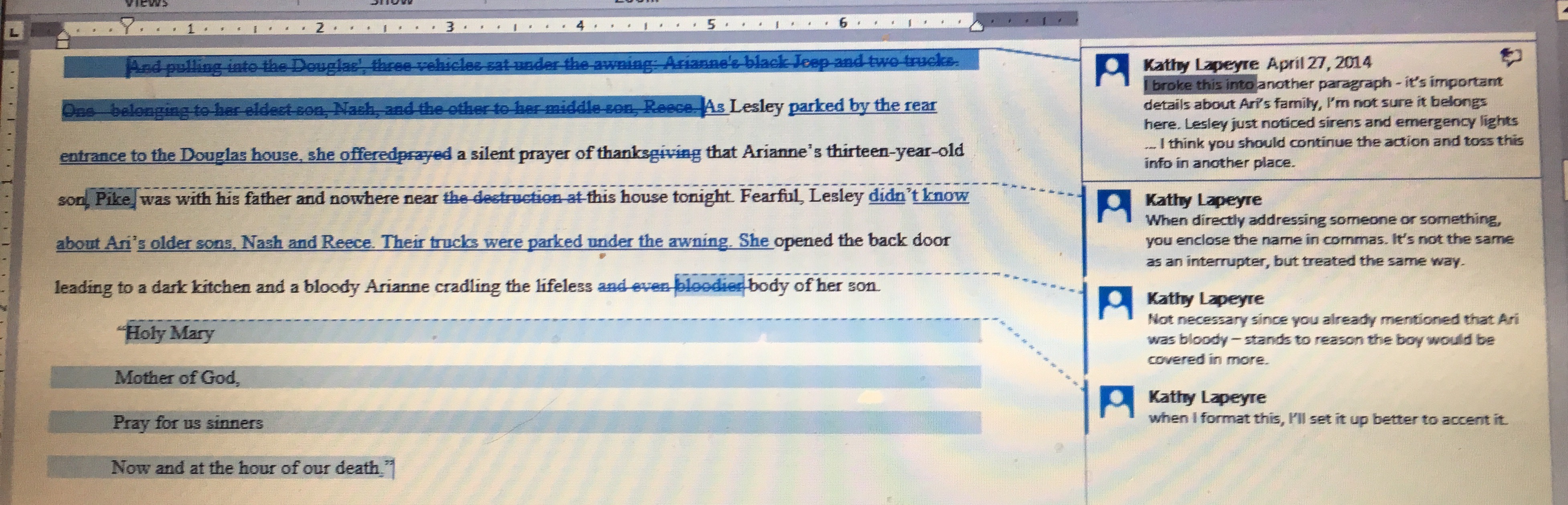 My editor – Kathy Lapeyre is a primarily a line editor. Here’s a bit what she does in her words: “I use a combination of line editing and copy editing on the first pass… then copy editing mixed with proofreading on the next one. If three readings are booked, I use a formula of line/copy, then copy, and finish up with a thorough proofread.”